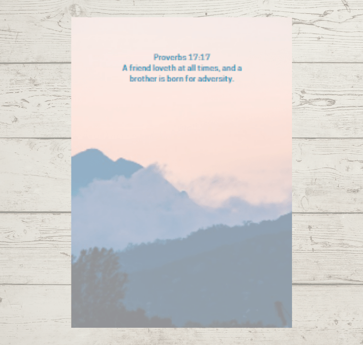 Front of card shows a beautiful mountain scene with clouds. On the inside of the card is the Bible verse Proverbs 17:17
